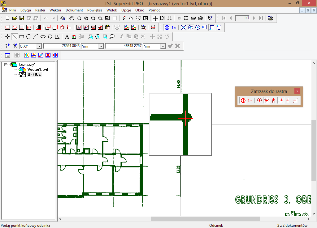 Rysowanie na tle skanowanych rysunków może być wykonane znacznie efektywniej za pomocą funkcji Zatrzask do rastra. Zatrzask do wybranych charakterystycznych punktów rysunku rastrowego może być włączony na stałe lub jednorazowo z wnętrza poleceń SuperEdita.