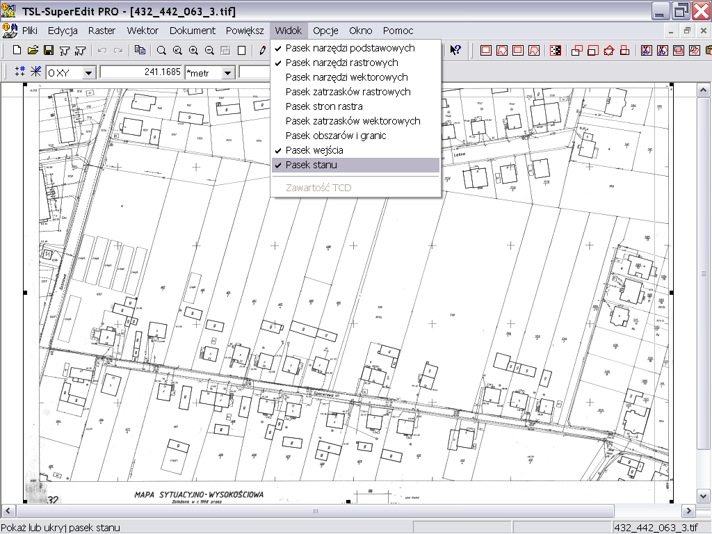 SuperEdit nie tylko jest programem do edycji skanowanych map, ale również może wykonywać podstawowe funkcje systemu CADowskiego. Umożliwia to wykonywanie poprawek na istniejących mapach rastrowych lub, mając jako podkład (skalibrowaną) mapę, tworzenie nowego rysunku CADowskiego, który można drukować i eksportować w formacie DXF do innego systemu. Poniżej zostanie przedstawiony prosty przykład, polegający na dorysowaniu linii podziału działki (1154) oraz wpisaniu nowych numerów działek 1154/1 oraz 1154/2. Operację wpisywania numerów wykonamy dwoma sposobami.