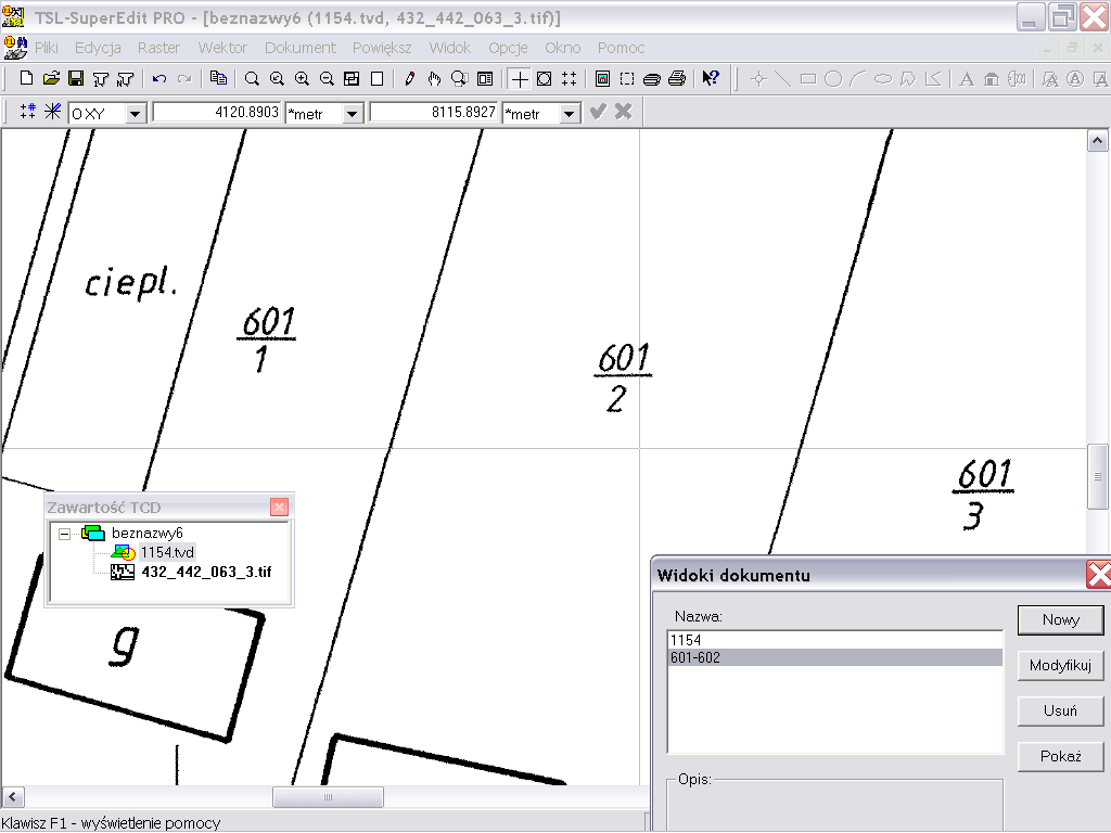 Na rysunku poniżej (w prawym dolnym rogu) widoczne jest okno Widoki dokumentu, wywołane z menu Dokument – Menadżer widoków. Opcja ta umożliwia zapamiętywania fragmentów mapy i przypisywania im odpowiednich nazw (np.: 1154, 601-602). Klikając na odpowiednią nazwę widoku automatycznie wyświetla się skojarzony z nią fragment mapy. Funkcję tę można wykorzystać właśnie przy kopiowaniu/wklejaniu fragmentu mapy, przełączając się z miejsca kopiowania (601-602) do miejsca wklejania (1154).
