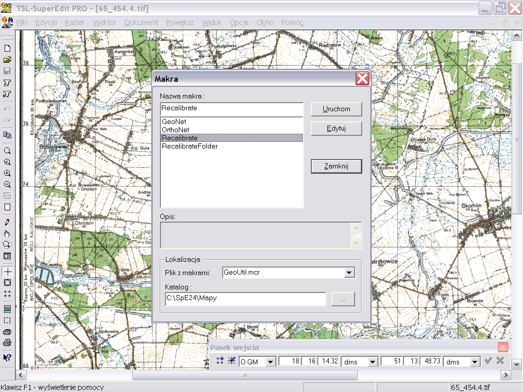 Wśród dostarczonych z programem makr bardzo ważne jest makro Recalibrate, które umożliwia automatyczną rekalibrację map pomiędzy różnymi układami geograficznymi.
